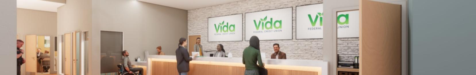 Construction kicks off soon, and will take about a year. You'll see progress, hard hats, and maybe one of us pretending to know how to use a power tool. During construction, we'll be operating from a temporary on-site location in the parking lot called the VIDA Village — fully equipped with teller stations, offices, and the same faces you know.